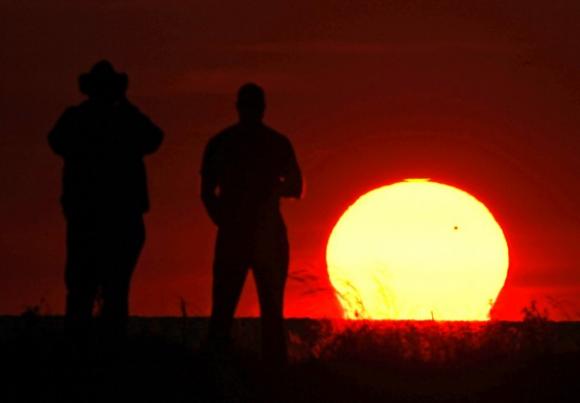 Dos espectadores contemplan en Cleveland (EE UU) el tránsito de Venus durante la puesta de sol del 5 de junio.